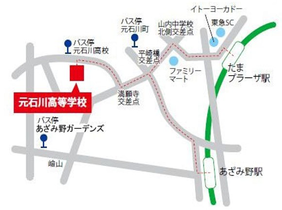 またはバス 5番乗り場「たまプラーザ駅」行きに乗車して約15分「元石川高校」下車すぐ。