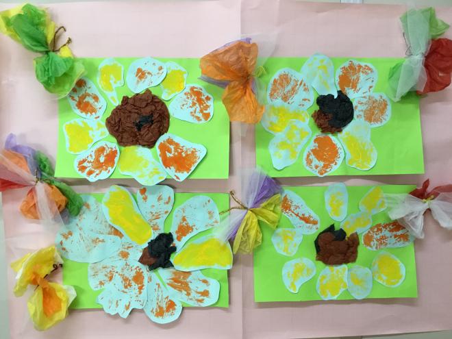 アート(図工、美術)の授業で、施設訪問の代表花である「ひまわり」を作りました。花弁は児童生徒の手形、足形を用いて表現しました。絵の具の冷たさ、感触等を感じ、驚く様子も見られましたが、夏に咲き乱れるひまわり畑をイメージして作り上げた力作です。花の周りを飛び交う蝶々も、児童生徒が作りました。