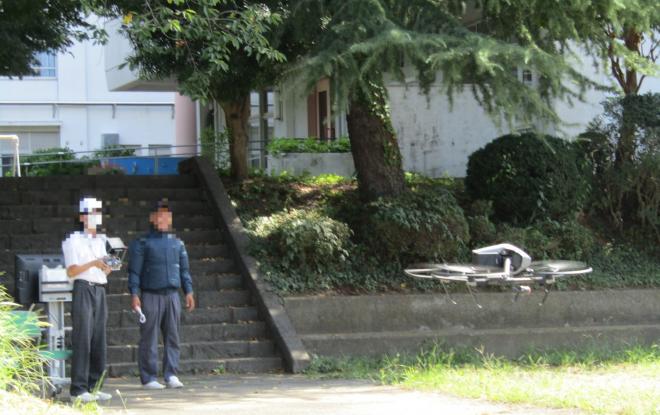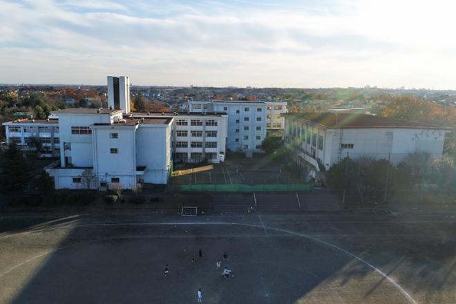 「ドローン活用講座」は夏に実施される短期集中講座です。ドローン操縦や飛行ルールに関して学び、本校グラウンドで実際に操縦します。右の写真は、ドローンを使って本校上空から撮影した写真です。
