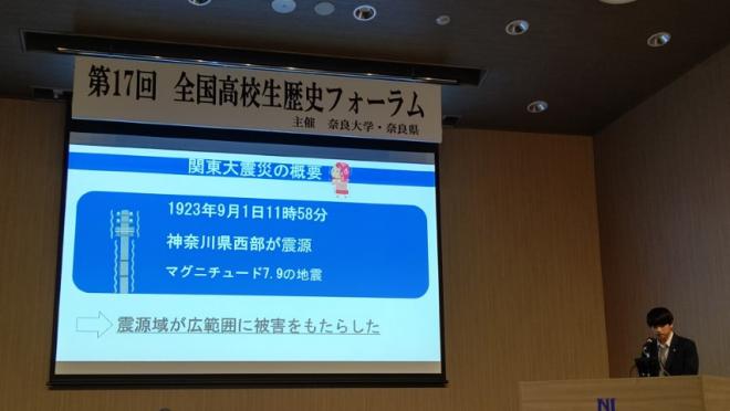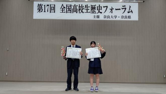 2023年11月25日~26日にかけて開催された第17回全国高校生歴史フォーラム(奈良大学・奈良県主催)に、歴史研究部の3年4組秋山七海さん、3年5組米澤檜さんが参加しました。優秀賞に選ばれた上位5校の中で、秋山さんが「現代に伝わった人形芝居―班目人形芝居の歴史―」、米澤さんが「関東大震災下の箱根地域の被害と復旧―残された史料・石碑から読み解く―」と題して、研究発表を行いました。発表の結果、地域の歴史や文化を大切にする機運を醸成するにふさわしい内容だったということで、秋山さんの発表が知事賞を受賞しました。詳細は下記のURLをご参照ください。