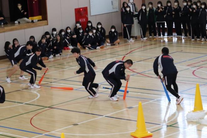 2月22日2回目の登校日は、卒業セレモニーの学年レクをおこないました。卒業準備委員が企画したクラス対抗で競技です。レースは盛り上がり楽しい時間が過ごせました。その後、準備委員が作った動画をみて3年間を振り返りました。よい思い出つくりができました。準備委員の皆さんお疲れさまでした。3年生はあと2日の登校で卒業です。