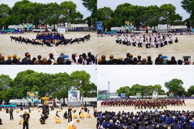 体育部門最大の魅力の一つである応援合戦では、各連合の3年生が創作・編曲したダンスを披露し競い合い、また、マスコットは、ダンスのテーマや連合の色に合わせて看板を製作し、体育部門を背後から彩りました。マスコット部門と競技部門総合は黄連合、ダンス部門は青連合が勝利を収めました。