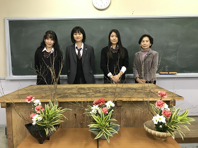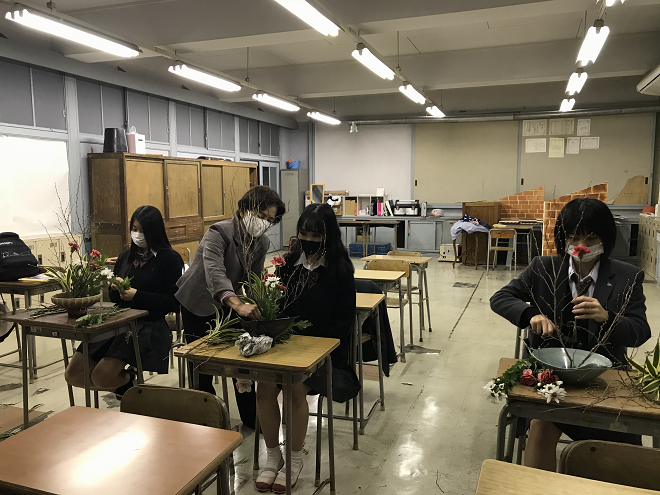 お稽古では先生の丁寧なご指導のもと、その時の花材にあう基本的な活け方を教わり、その後各自で活けてアドバイスをいただきます。また、文化祭では個人の作品を展示し、生徒をはじめ一般の方々からもご好評をいただいています。部員は少ないですが楽しい部活です。是非気軽に見学に来てください。