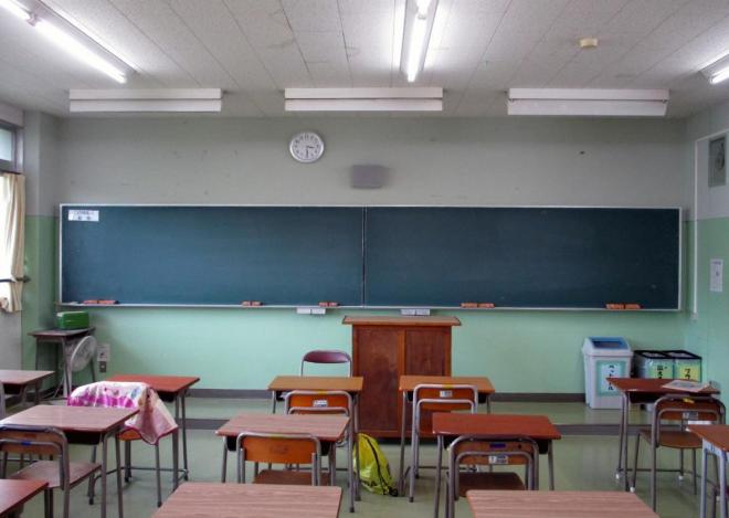 教室前面は時計のみとし、黒板には連絡事項の記入や掲示物を貼らず、授業に集中して取り組める環境づくりに努めています。すべての教室で、このような教室環境になっています。毎月1日を「フロントゼロデー」として、教室環境の確認をする日を設定しています。