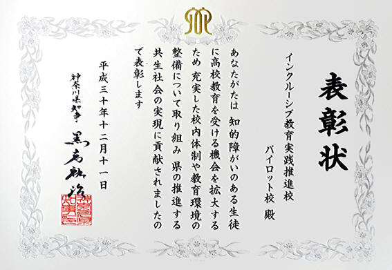 平成30年12月11日に神奈川県庁本庁舎にて授賞式が行われ、厚木西高校、茅ケ崎高校、足柄高校の3校がインクルーシブ教育実践推進校(パイロット校)としての功績をたたえられて、黒岩県知事より表彰状を授与されました。