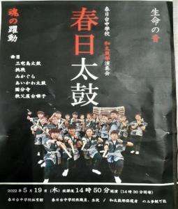 春日台中学校では、和太鼓部の演奏会が開かれていました。コロナ禍により会館での演奏会やお祭りへの参加が著しく減り、生徒の発表の場を保障するために、春日台中学校が感染症対策を万全にして実施していました。(ウィズコロナ対応です)