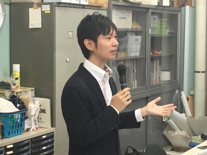 全職員が参加し、グループ毎に分かれてまとめたアイデアを発表し合う様子