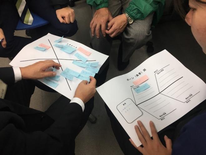 シンキングツールのXチャートのアイデアをボーン図に組み替える様子
