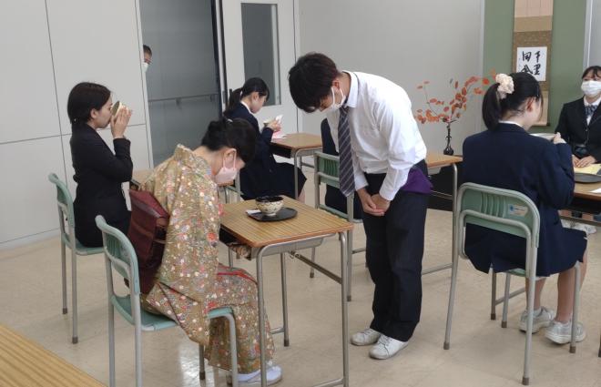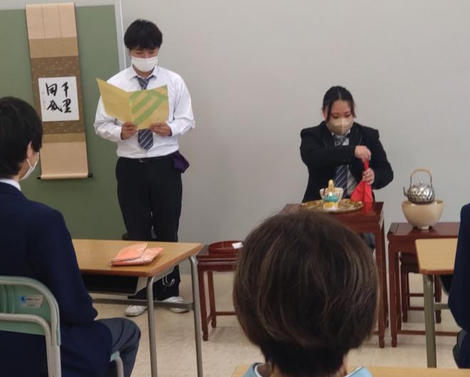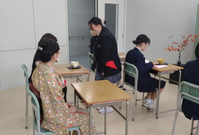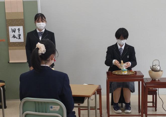 茶道部です。季節に合ったお菓子を楽しみながら、お茶の点て方だけでなく、おもてなしの心や礼儀作法を学びます。