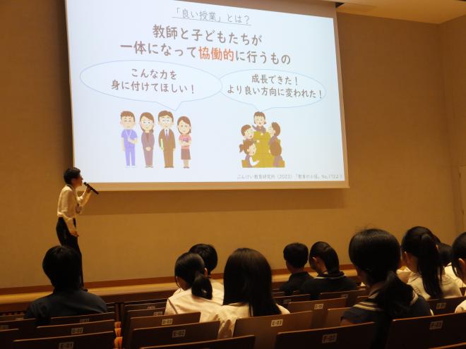 横浜国立大学教育学部 梅澤 秋久 教授を講師として招き、既存の知識や技能(文化)を活用し、新たな「知」を創造する「きょうどう」的な学びについての理解を深めました。演習を通して、求められている教職員像を明確にすることができました。また、神奈川県教育委員会 教職員企画課の講義では、教員になるために必要な教員免許の取得方法等の説明を受け、進路について改めて考える時間となりました。