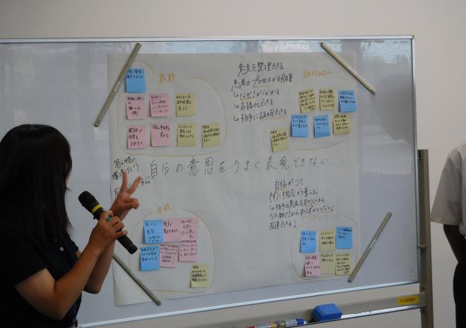 事例を通し、インクルーシブ教育において大切なことや、自分たちにできることについて考え、教育のユニバーサルデザインについて理解を深めました。また、子どもの課題となる背景を「自分の意識をうまく表現できない」子どもと仮定し、その支援策を考えました。どのグループも初対面のメンバー同士にも関わらず、限られた時間の中で、役割を決め、協議・発表を行っていました。生成AI等を活用していくなどの新たな視点をもち、多くの支援策を提案することができました。