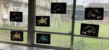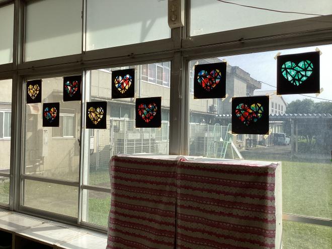 4年生は、図工の時間にステンドグラスの作品を作りました。カラーセロハンやお花紙をはさみで切って、のりで貼り付けました。はさみは、扱い方を確認してから挑戦!みんな集中して取り組んでいました。最後は教室の窓に飾り、きらきら光る作品を鑑賞しました。