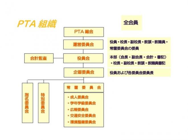 本校のPTA活動は、成人委員会・学年学級委員会・広報委員会・交通安全委員会・環境整備委員会各委員会のいずれかの委員となり、に分かれて原則3年間活動します。具体的な活動内容については以下の通りです。