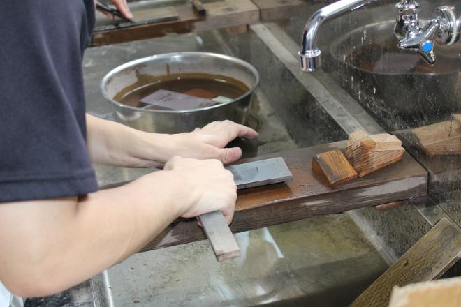 まず、3年生の先輩が研ぎ方を1年生に教えています。