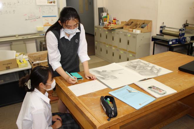 新入生を、3年生の先輩が作業の手ほどきをしています。