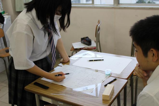 令和6年10月8日(火曜日)3年生がクラス企画の準備を始めています。カフェ企画に向けて、住環境とデザインの生徒がスタンド看板を木と鋸を使い、自作しています。会場は生産が設計図を書いています。