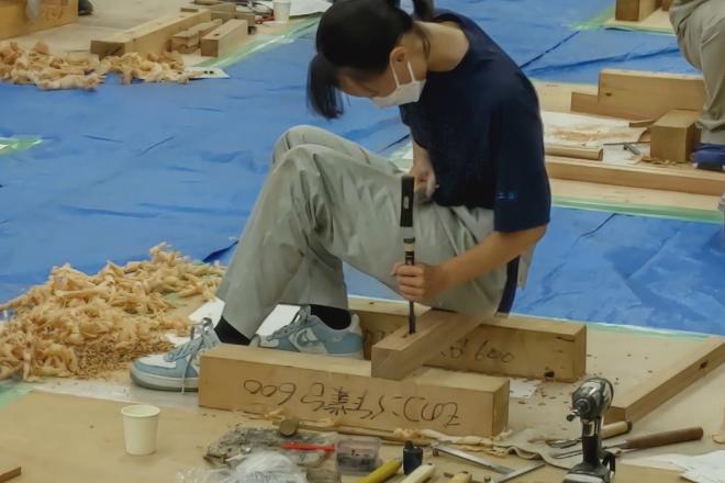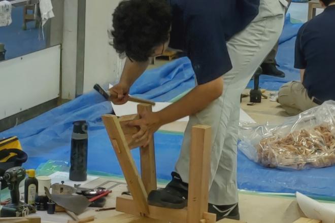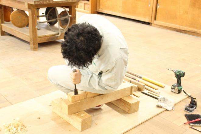 木材加工の授業の様子です。釘を使わない伝統的な工法で作業をしています。