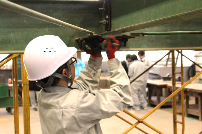 建物の基礎である鉄筋をくみ上げる実習です。危険な作業になるので、ヘルメットを必ず着用します。