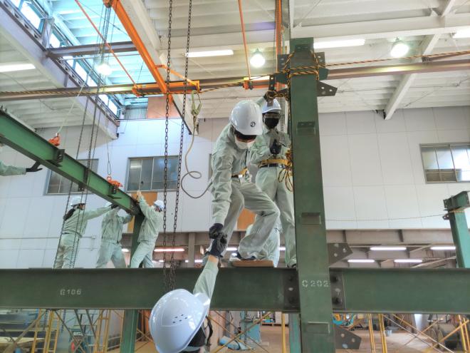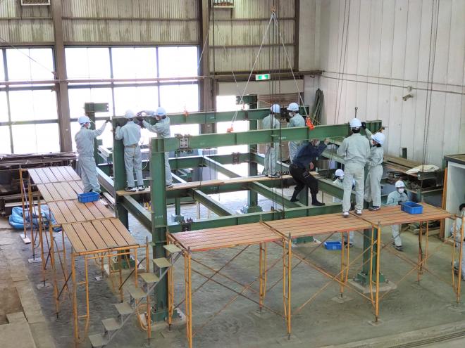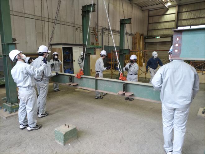 【鉄骨組立実習】 1階梁の運搬と、2階梁の組立の様子です。