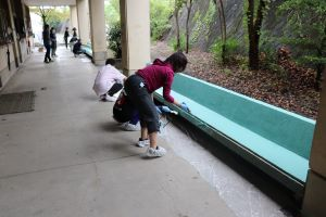 体育館の下、部室の前にコンクリート製のベンチがありますが、ペンキがかなり剥がれてしまっている状態でした。技能員さんに事前の洗浄、ペンキ等の準備をしていただき、当日は全員で協力して作業をし、楽しくペンキ塗りをすることができました。作業開始から約1時間、ベンチはあっという間にきれいに生まれ変わりました。参加者からは「来年はどこを塗ろうか!?」という声も数多く聞こえていました。ベンチがきれいになり、各部の活動が、より熱の入ったものになってくれるとと嬉しいです。