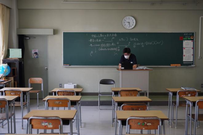 クラスを20人ずつに分け、生徒はそれぞれ別の教室に分散し、密にならないよう間隔を空けて着席します。