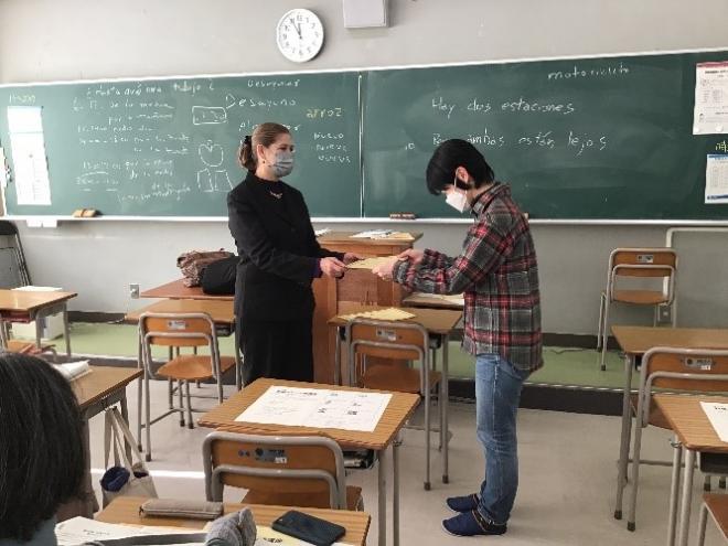 受講者17名は、本校外国語科の日比野規生教諭(令和4年度から本校3年自由選択科目『スペイン語』を担当)と特別講師の山田・ルス・メリー氏(コロンビア出身)とともに実践的な会話表現を楽しみながら学んでいました。