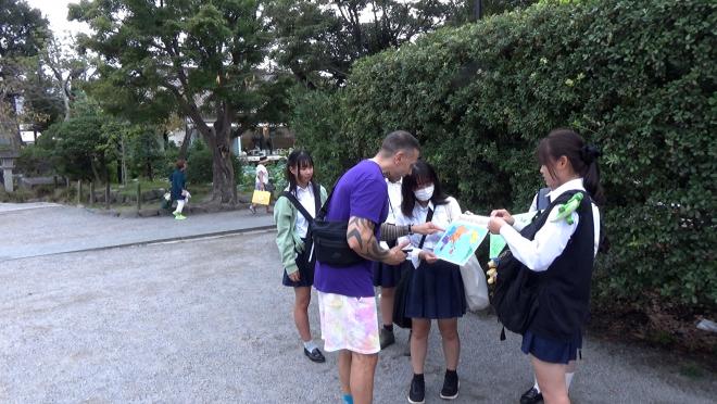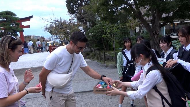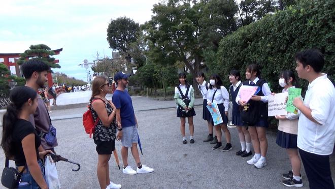 鶴岡八幡宮の境内で外国人観光客にスペイン語で話しかけ、名前、年齢、出身地など簡単な質問や仕事内容や嗜好など、やや複雑な内容をインタビューしていました。インタビューに答えてくださった方々にはお礼として折り鶴などを差し上げました。