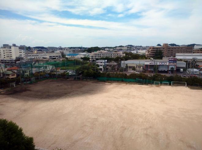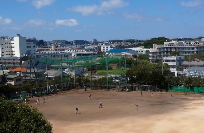 夏空の下、今日は野球部が練習試合をしていました。校舎からの試合風景を一枚お届けします。