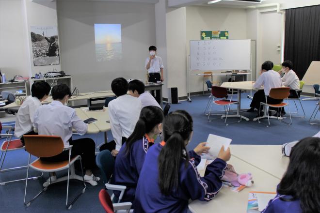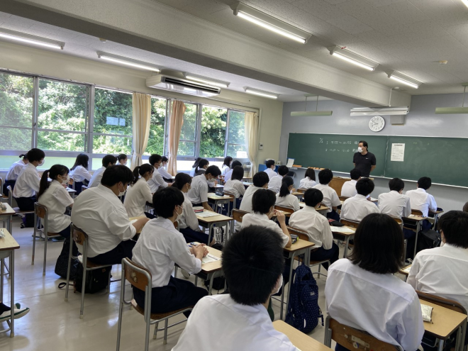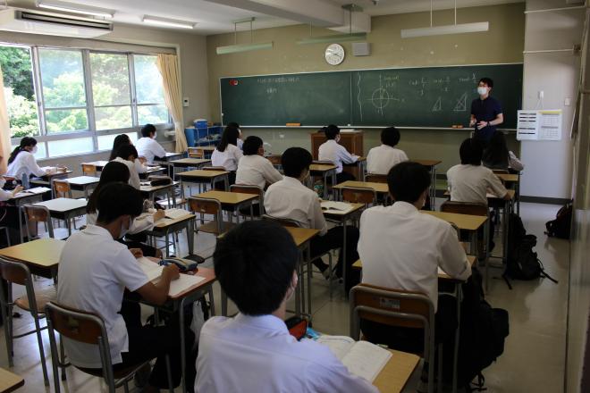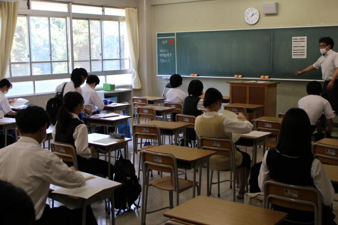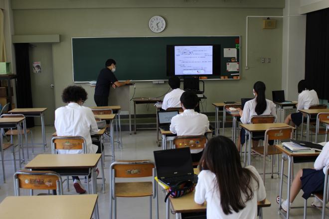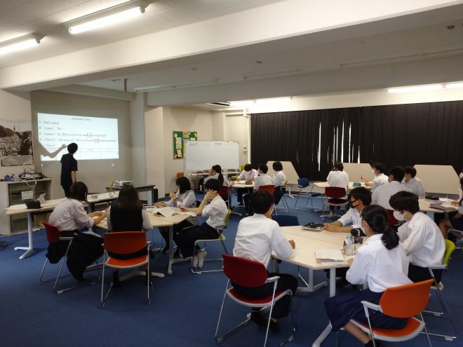 今日から通常の50分授業が開始しました。写真のようすは本校のプレゼンテーションルームで行われている1年生の英語の授業です。コロナの感染が再び広まりつつある状況ですが、生徒はみんな感染防止対策をしっかりとって、授業に集中して取り組んでいます。