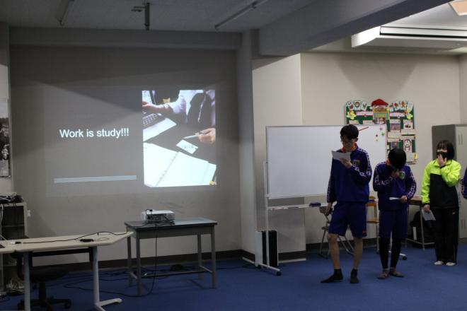 英語表現の授業では、スライドを使って英語での発表が行われています。質疑応答にも四苦八苦しながら英語でやりとりしている生徒のようすが見られました。