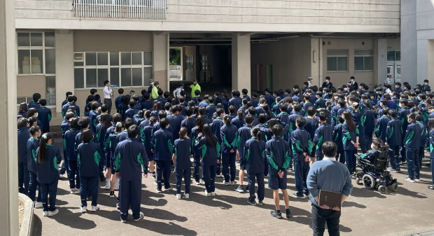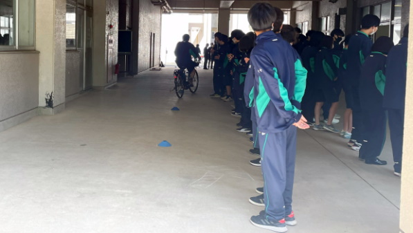鎌倉警察署交通課・県警察本部交通総務課教育隊及び鎌倉市都市計画課の方々によるご指導のもと、生徒たちは『スラローム走行』『車両運転手の死角』『自転車点検』を体験し、交通安全と事故防止の意識を高めました。