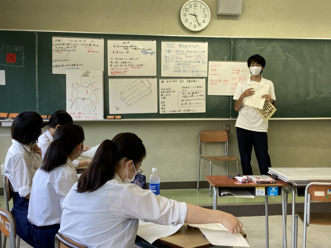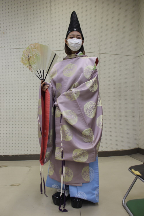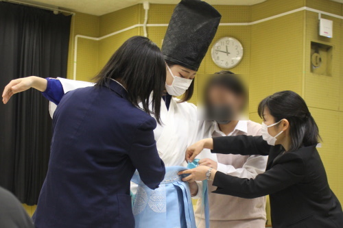 2学年国語授業「古典A」で、生徒が狩衣(かりぎぬ)の着付け体験を行いました。