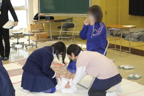 生徒たちは指導主事の方々の説明を聞きながら、モデルとなった生徒が身につけていく様子を興味深く見て、古典文化の一端を学ぶことができました。