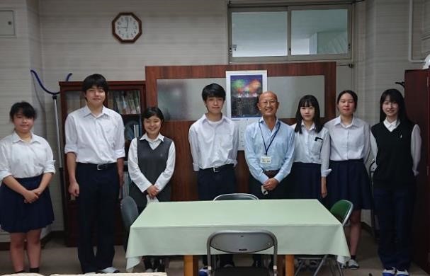 今年度の生徒会メンバーをご紹介します。新メンバーが校長室に挨拶に来たときの1枚です。萩谷校長先生と一緒に撮影しました。