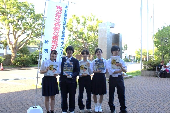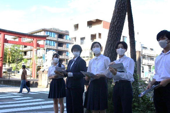 令和5年7月6日(木曜日)生徒会本部役員5名が鎌倉市主催の青少年健全育成推進街頭キャンペーンに参加しました。多くの人が行き交う鎌倉若宮大路で青少年の健全育成の実現を呼びかけるチラシを配りました。