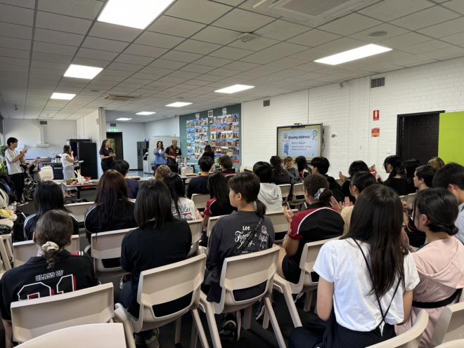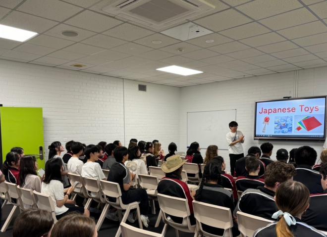 8月の訪問に先立ち、姉妹校交流に参加する生徒達が現地の学校で行う日本文化紹介のプレゼンテーションの予行をしています。職員の指導を受け、一生懸命練習をし、オーストラリアでの発表に活かします。