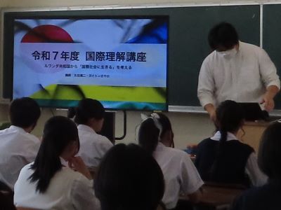 現在JICA海外協力隊員としてルワンダに駐在している本校英語科職員の太田滉二先生が、現地から中継で話をしてくださいました。ルワンダに関するクイズを織り交ぜながら、今回は生徒から事前に集めた質問に回答していただきました。歴史・言語・文化・生活・教育などに関する生徒からの多様な質問に対して、豊富な資料を用いながら丁寧にお話してくださいました。最後に、日本国内における私たちの環境は決して当たり前のものではないことにふれ、「様々な世界に身を置くこと」の大切さを伝えていただきました。生徒たちも深くうなずいていました。