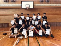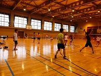 <バドミントン部> コーチや先輩がゼロから指導しています。大人数ですが、大会での活躍を目指して、日々活動しています。 |