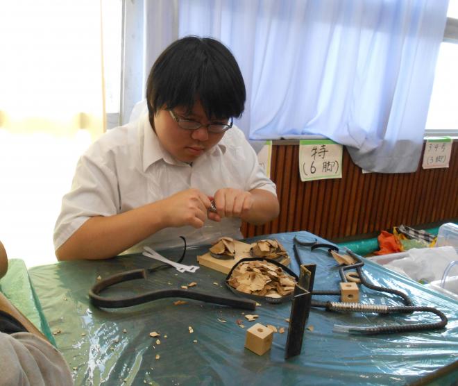 形のない、抽象的なテーマに少々とまどいながらも、筑波大学の宮坂慎司先生が持ってきてくださった「鉄筋」「木っ端」「木製の部品」「紙粘土」などを組み合わせて、それぞれがテーマに向き合っていました。