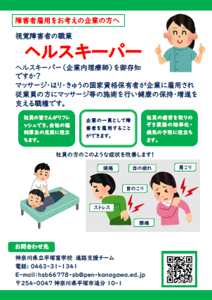 ヘルスキーパー(企業内理療師)を採用したい、あん摩マッサージ指圧師・鍼灸師を雇い社員の健康の保持・増進をしたいが、どうしたらよいのだろう?と思われたら、平塚盲学校にご相談ください。 連絡先:0463-31-1341 担当:進路支援チーム