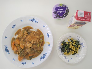 16日 水曜 夏野菜のカレー、青菜とコーンのソテー、牛乳、ヨーグルト