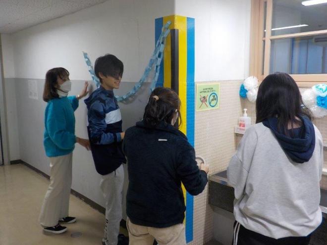 食堂前では、会場係がお楽しみ会のための装飾に取り組んでいました。