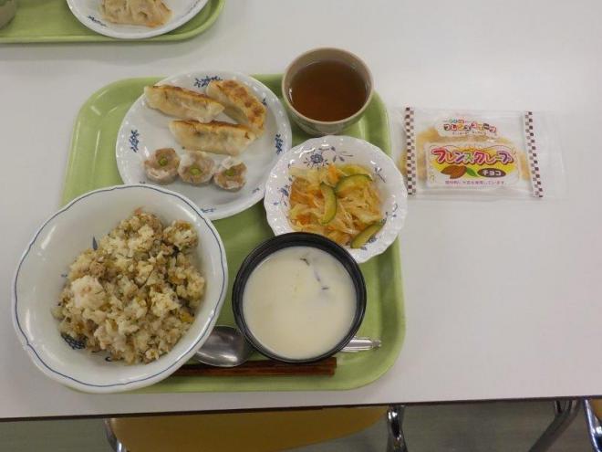 卒業生を祝う会当日。まずは、食事会です。新型コロナウィルス感染症拡大防止のため、黙食ではありましたが、卒業する舎生のリクエストメニューです。リクエストしたのは、唐揚げ、フライドポテト、煮物、シューアイスです。