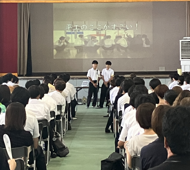 当日は暑い中、多くの方にご来校頂き、熱心にメモを取られている保護者の方も見受けられました。説明会終盤では本校生徒会生徒2名が「平工のここがすごい!」というテーマで本校の良いところを生徒目線で語りました。生徒からは「特に、実習科目の授業が面白い。」「実験・実習レポートを毎週頑張っている。」「共通の趣味・興味関心をもった友人が必ずできる。」などの話がありました。