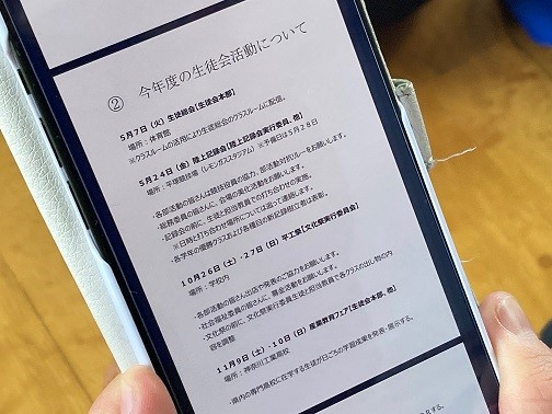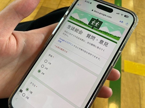 令和6年5月7日(火)に生徒総会を実施しました。生徒会の生徒による司会・進行のもと、各部活の予算や行事予定についての確認を全校生徒で行いました。在校生からの意見や質問は、Googleフォームで集約し、生徒会の生徒経由で応答しました。Googleフォームを活用することで、質問を気軽にしやすく、瞬時に意見を集約することができます。