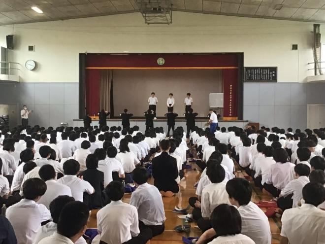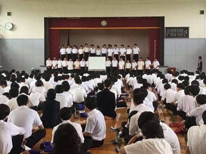 7月19日(金)に1学期の終業式を行いました。生徒の皆さんは、先生方のお話を聞きながら、1学期を振り返ったり、夏休み中の過ごし方を考えている様子でした。また、ラグビー部が、素晴らしい校歌を披露してくれました。