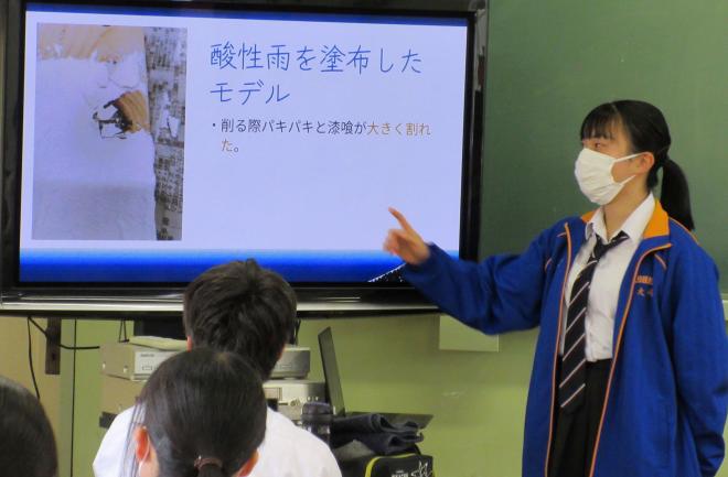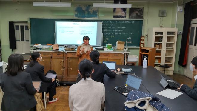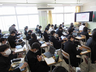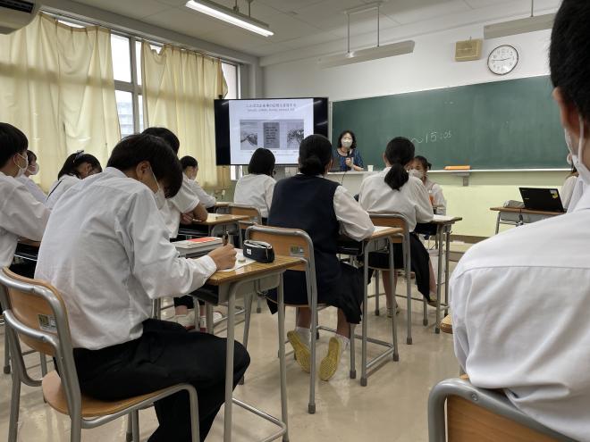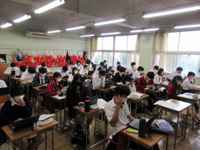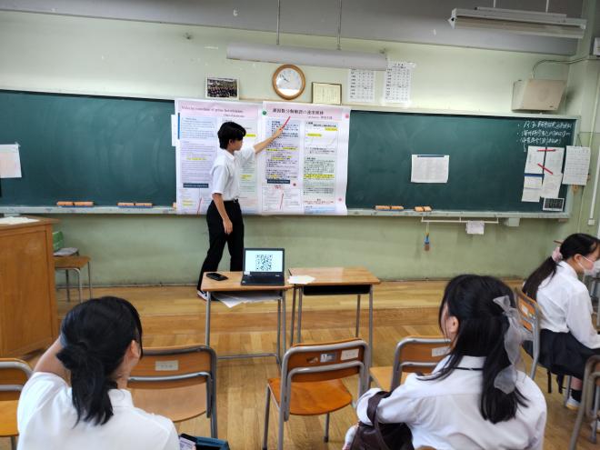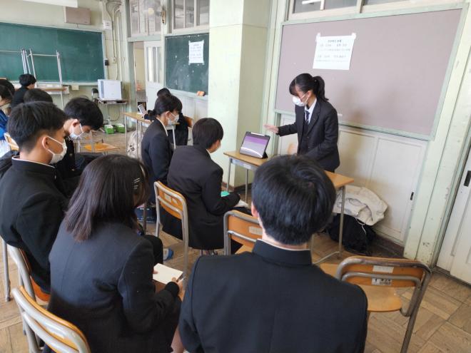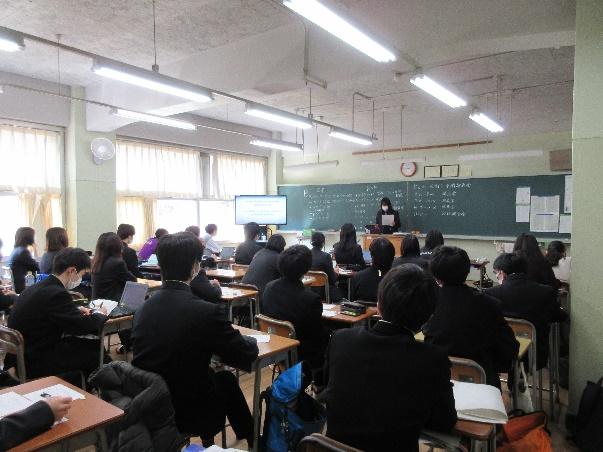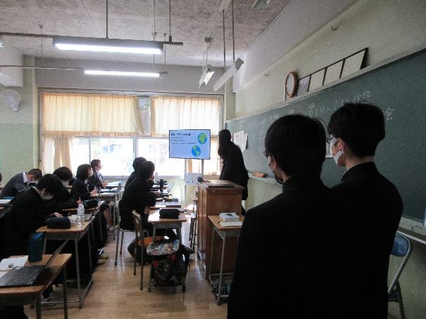 1年生はオンラインで自分の関心のあるテーマを選びgoogle meetで視聴しました。2年生は実際に発表が行われている教室に足を運び研究の成果に耳を傾けていました。1年生にとっては再来年度、2年生にとっては来年度、自分の研究をどのように発表するのかのイメージがつかめたようでした。