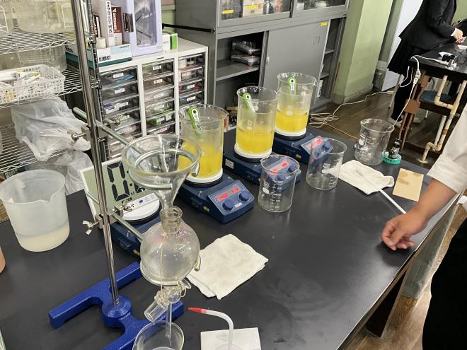 以下の写真は「車社会とバイク」ゼミで使用済み食用油から燃料を生成しようとしている様子です。