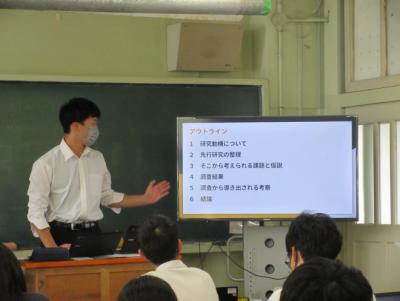 4月の初めから各ゼミで扱っている本を輪読して研究に対して理解を深めてきました。その後、各自で設定したテーマについて研究を進めていき、現在までの探究の経過をスライド形式で来校者や後輩に発表しました。各自の持ち時間10分の中で、できる限り分かりやすく、また、多くの情報を伝えるための工夫が随所で見られました。