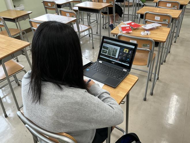 スライドができた生徒は、担当の先生にプレゼンテーションし助言をもらって、さらにブラッシュアップしていきます。